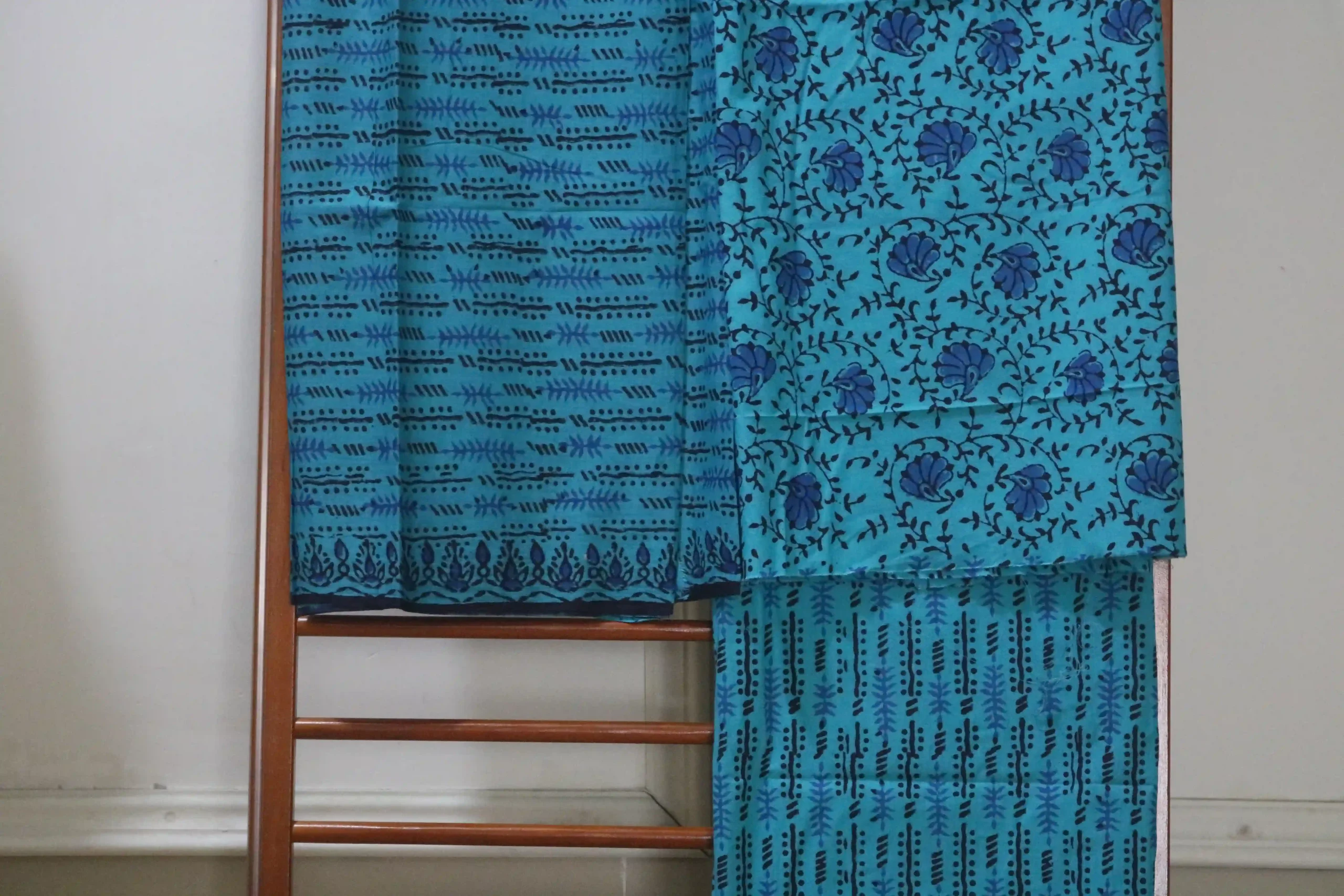 Product details: Each piece of dress material features intricate hand block prints, a time-honored technique that involves stamping dye onto fabric using hand-carved wooden blocks. The result is a vibrant and detailed design that adds a touch of artisanal charm to your creations. ; Accompanied with a bottom and dupatta. ; Comes with the Baroda Prints promise of premium quality.