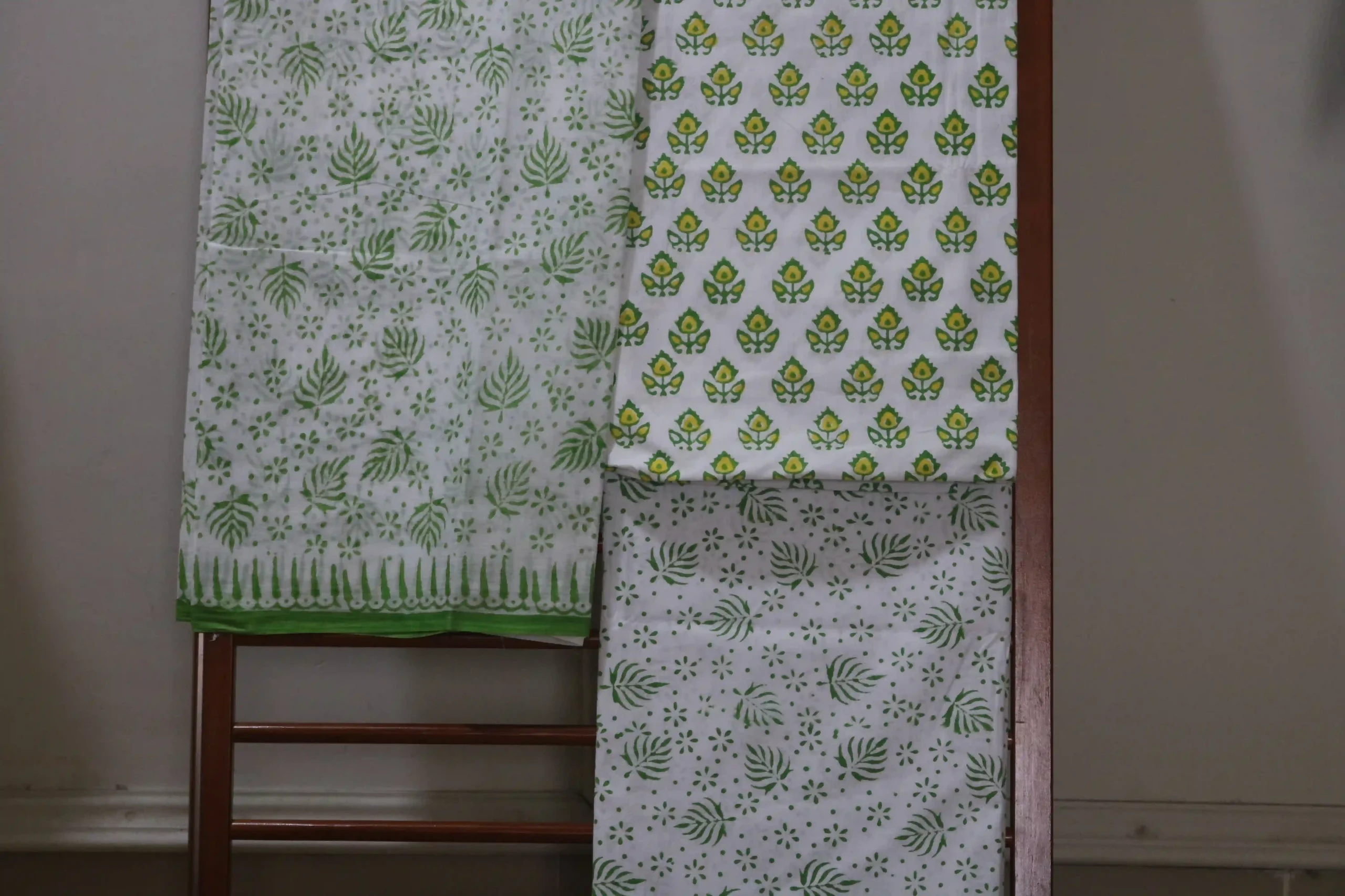 Product details: Each piece of dress material features intricate hand block prints, a time-honored technique that involves stamping dye onto fabric using hand-carved wooden blocks. The result is a vibrant and detailed design that adds a touch of artisanal charm to your creations. ; Accompanied with a bottom and dupatta. ; Comes with the Baroda Prints promise of premium quality.