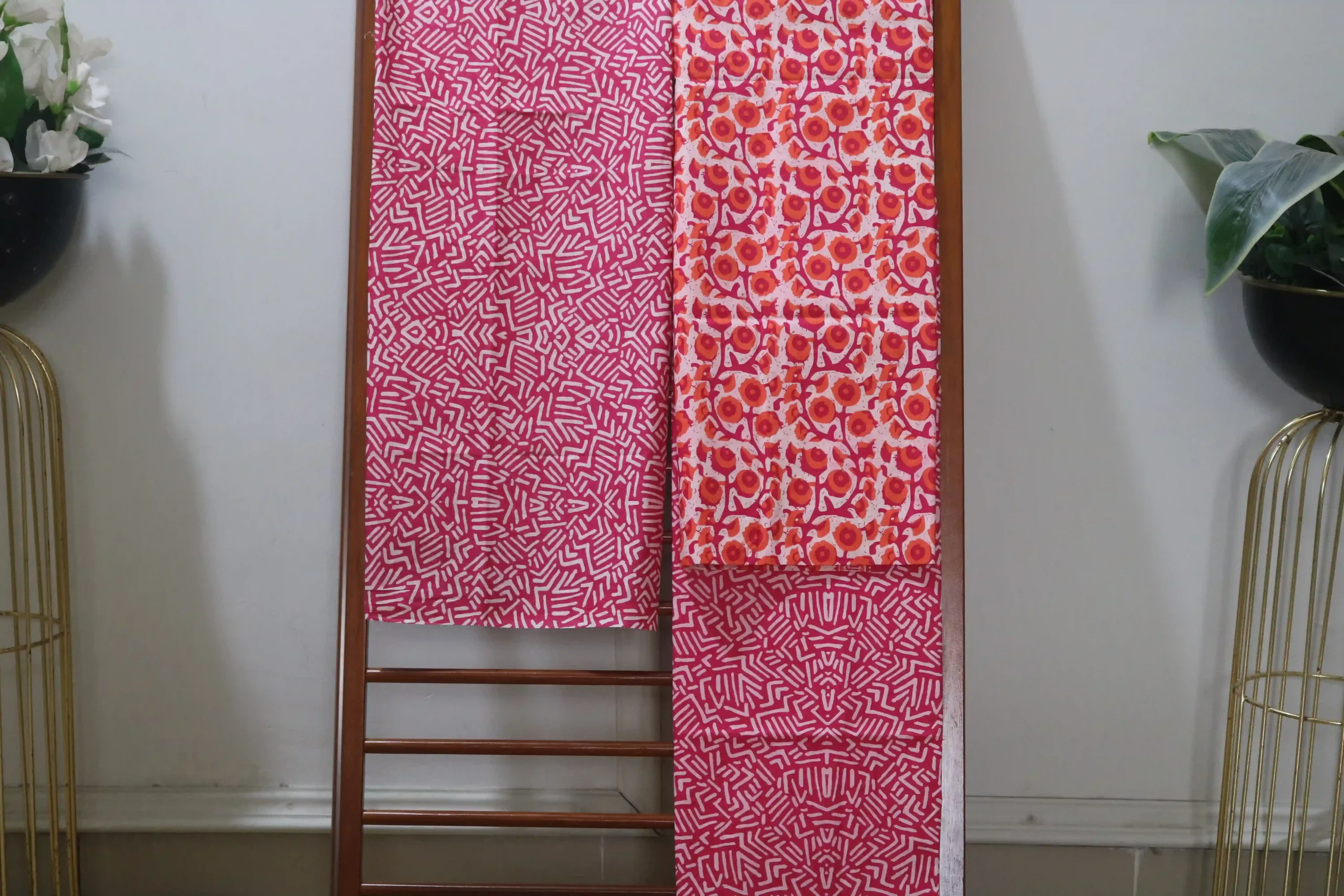 Product details: Each piece of dress material features intricate hand block prints, a time-honored technique that involves stamping dye onto fabric using hand-carved wooden blocks. The result is a vibrant and detailed design that adds a touch of artisanal charm to your creations. ; Accompanied with a bottom and dupatta. ; Comes with the Baroda Prints promise of premium quality.