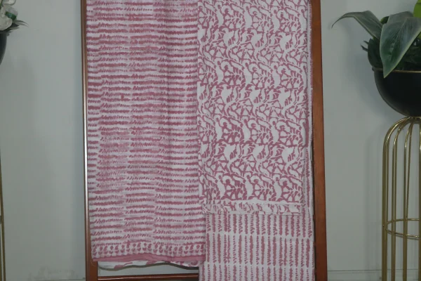 Product details: Each piece of dress material features intricate hand block prints, a time-honored technique that involves stamping dye onto fabric using hand-carved wooden blocks. The result is a vibrant and detailed design that adds a touch of artisanal charm to your creations. ; Accompanied with a bottom and dupatta. ; Comes with the Baroda Prints promise of premium quality.