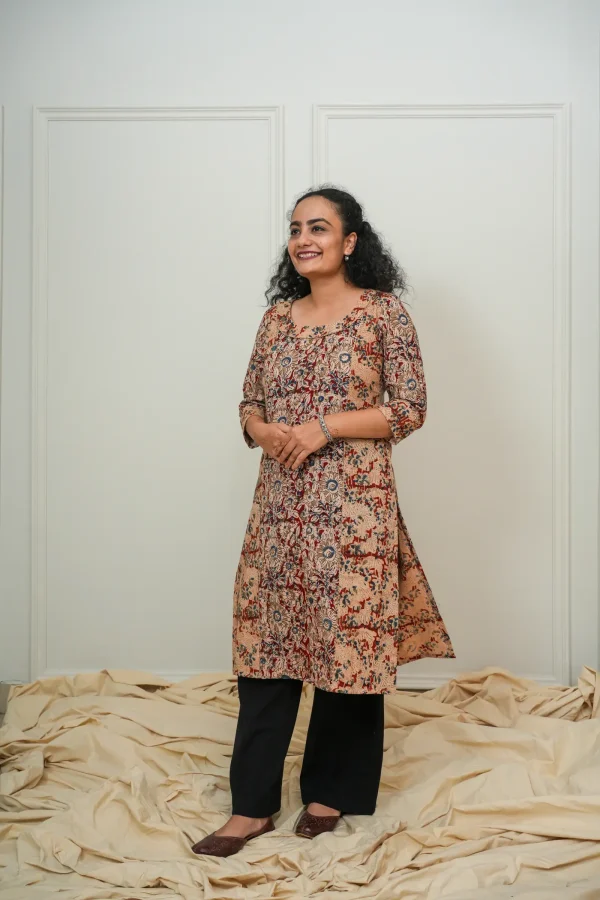 Celebrate your inner diva with the ethereal beauty of the Kalamkari Hand block Printed Cotton Kurti. This kurti exudes a sense of artistry and grace. The delicate neckline adds a hint of sophistication, while the 3/4th sleeves offer a perfect balance between coverage and comfort. Crafted from soft and breathable cotton, it ensures a delightful wearing experience.